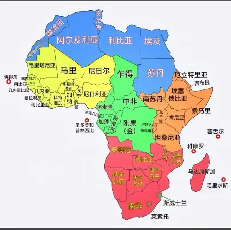在地理上习惯分为北非、东非、西非、中非和南非五个地区,共56个国家和地区。