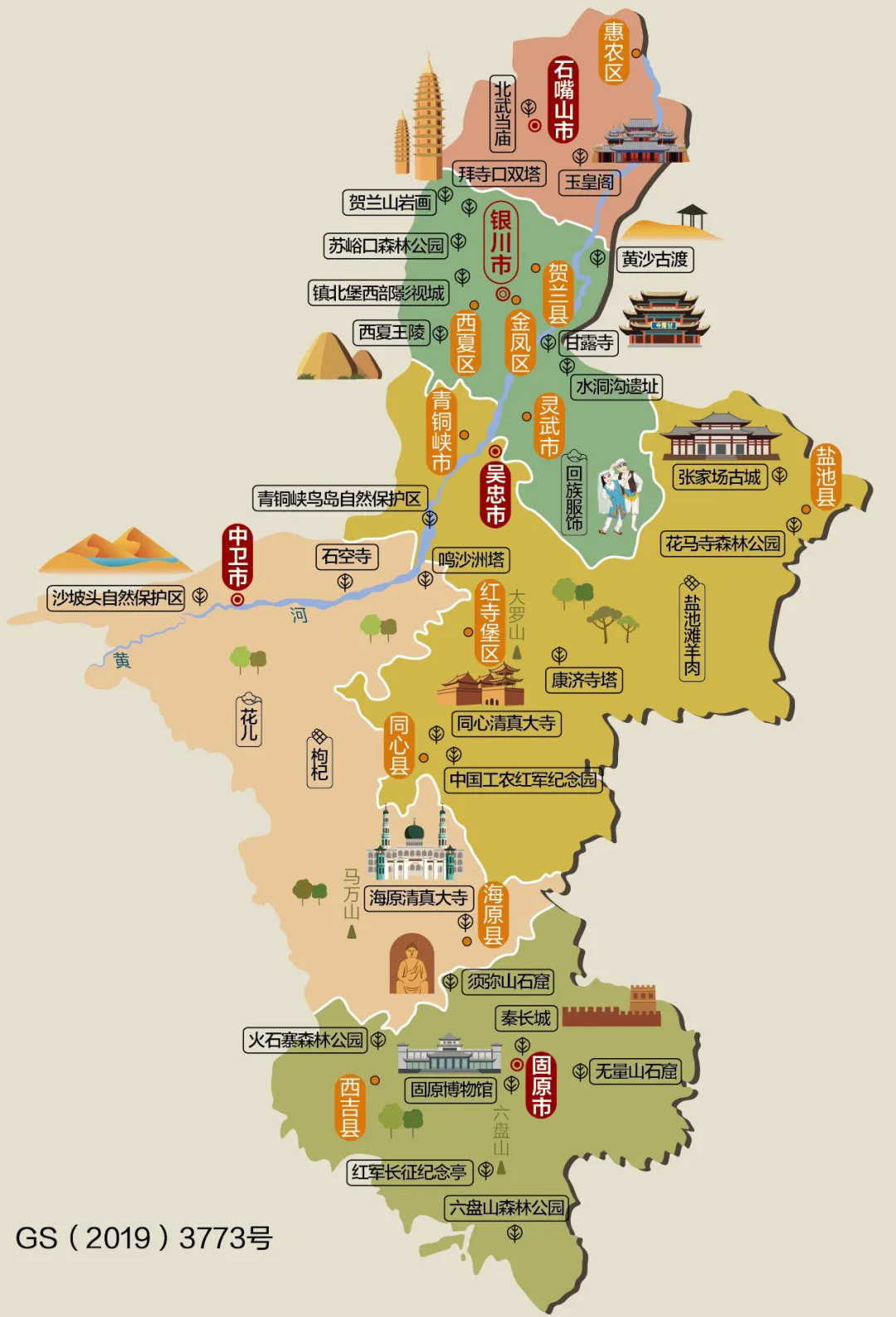 宁夏回族自治区,简称宁,首府银川,位于西北内陆地区,境内地势平坦,土壤肥沃,是我国重要商品粮基地,有“天下黄河富宁夏”“塞上江南”之美誉。宁夏地处黄河水系,地势南高北低,呈阶梯状下降,丘陵沟壑林立,地形分为北部引黄灌区、中部干旱带、南部山区三大板块。