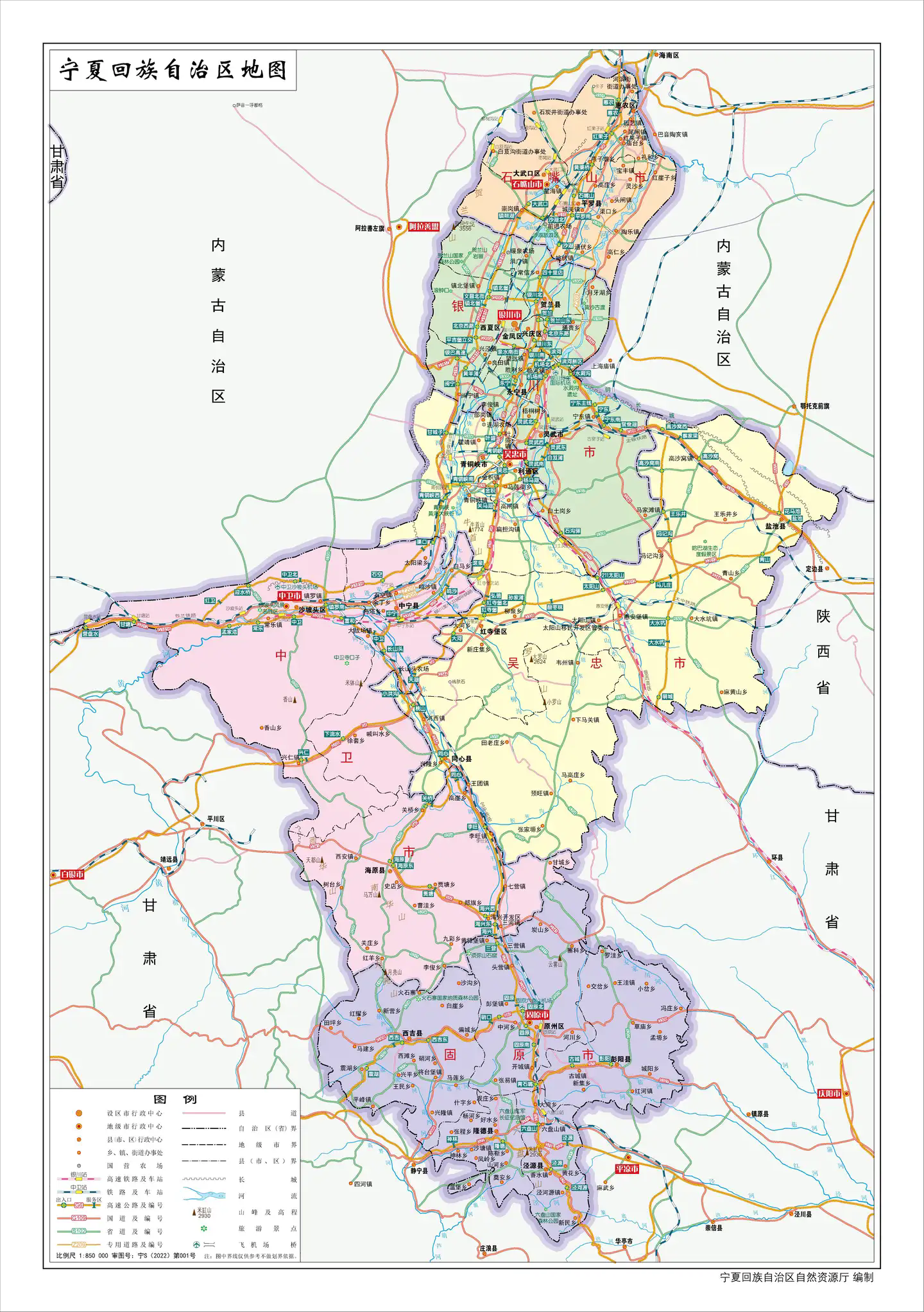 宁夏地图全图,位于我国西北地区,地处黄河中上游地带,东与陕西接壤,北与内蒙古毗邻,南同甘肃相连,是我国五个少数民族自治区之一。地图高清方便你查看使用哦,快来看看吧。