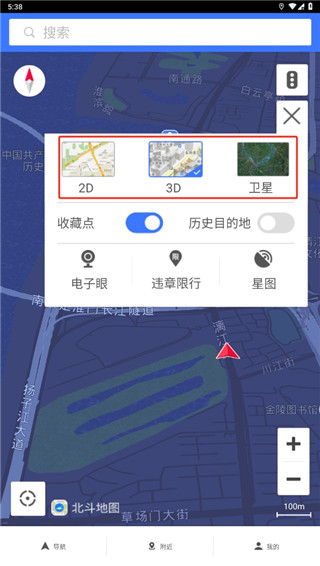 北斗卫星地图无广告是一款全新升级的地图导航应用,借助它能让交通出行更加便捷高效。软件界面简洁,操作流畅易上手,支持平面地图与卫星地图两种模式自由切换,同时可调整视角为俯视3D模式或平视模式,并具备实时路况查看功能,便于掌握道路动态。