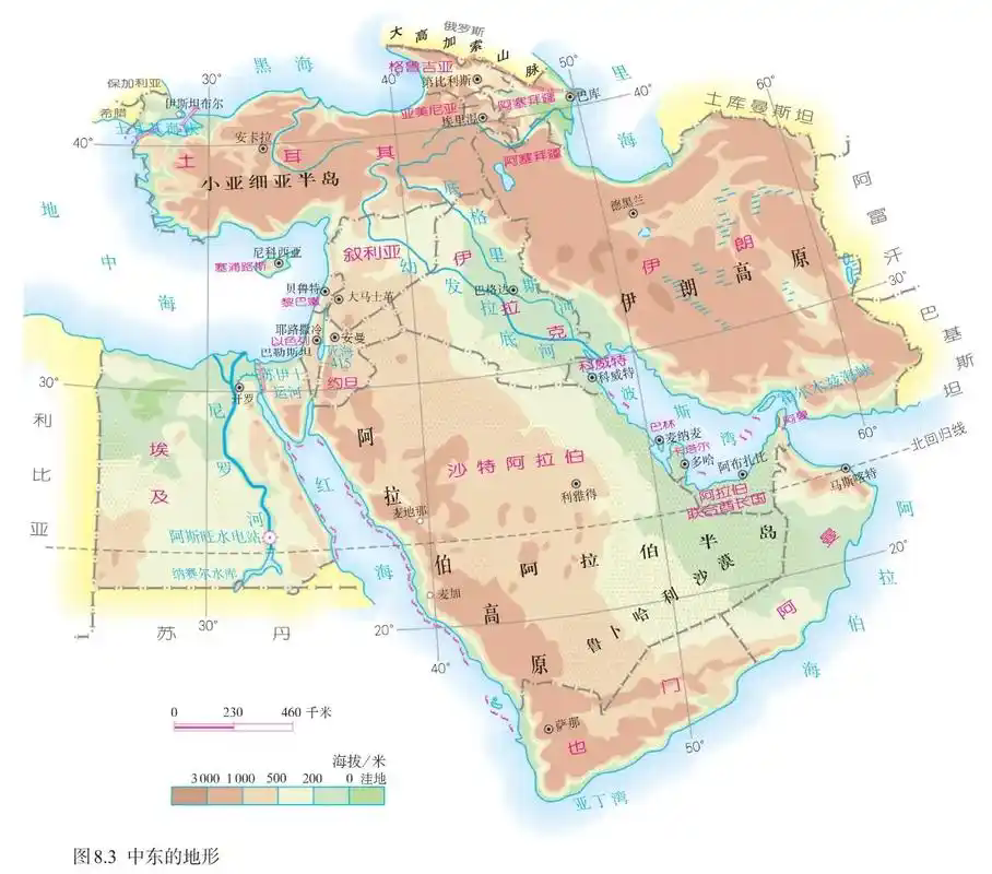 地形以高原为主,中部的美索不达米亚平原(又称两河流域),土壤肥沃,灌溉便利,农业发达。西亚东部为伊朗高原,往西有亚美尼亚火山高原和小亚细亚半岛的安纳托利亚高原,都是被阿尔卑斯—喜马拉雅运动时期形成的褶皱山脉环绕的内陆高原,其边缘分布着许多高大山系。