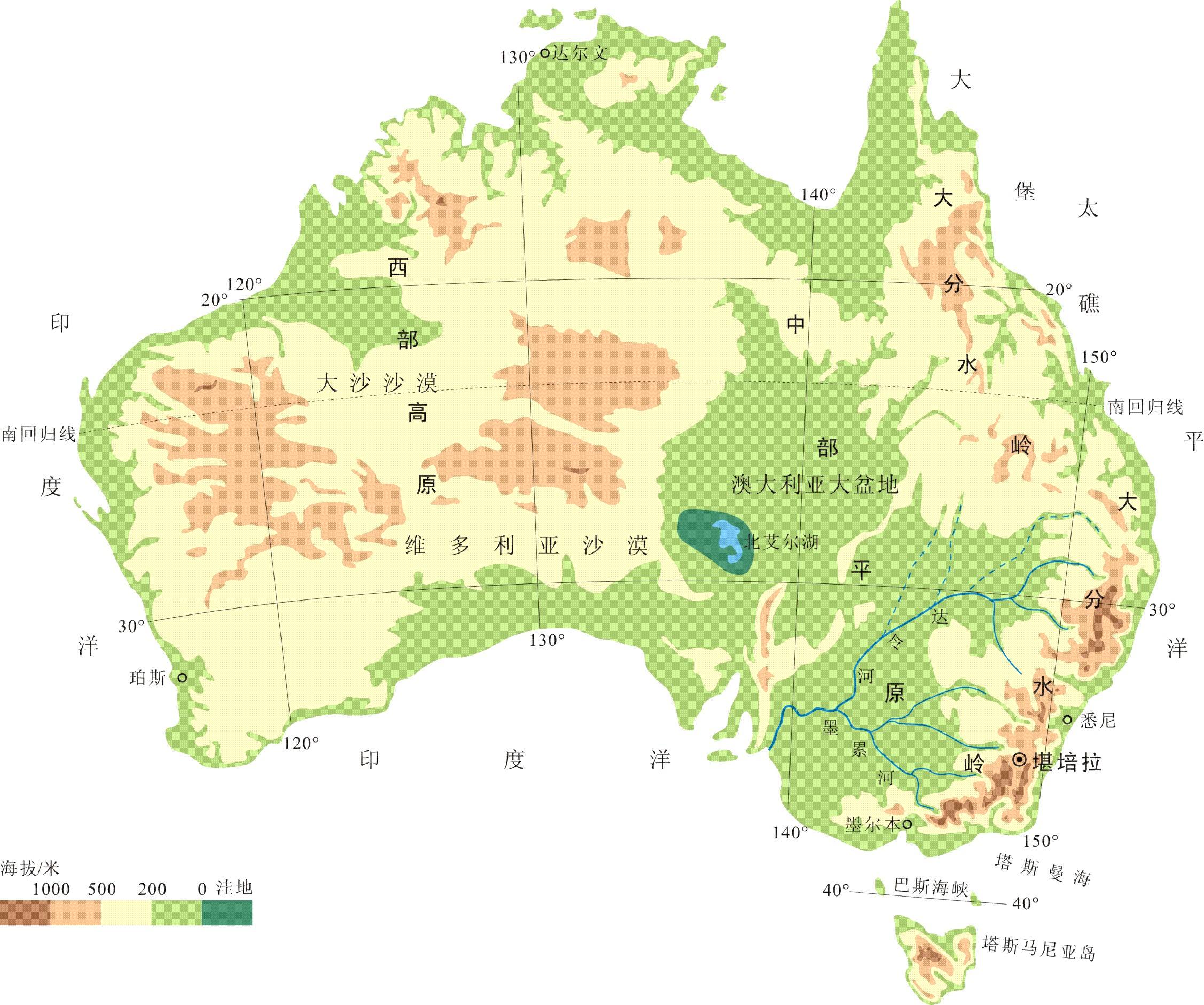澳大利亚位于南半球,东濒太平洋珊瑚海和塔斯曼海,北、西、南三面环印度洋,是世界上唯一国土覆盖整个大陆的国家,总面积768.82万平方公里,海岸线长36,735公里。其地形以低矮高原、沙漠和山脉为主,大分水岭纵贯东部,中部为干旱的澳大利亚盆地,西部为古老的高原。地图形似猫狗组合,北部属热带气候,南部属温带气候,季节与北半球相反(6-8月为冬季)。
