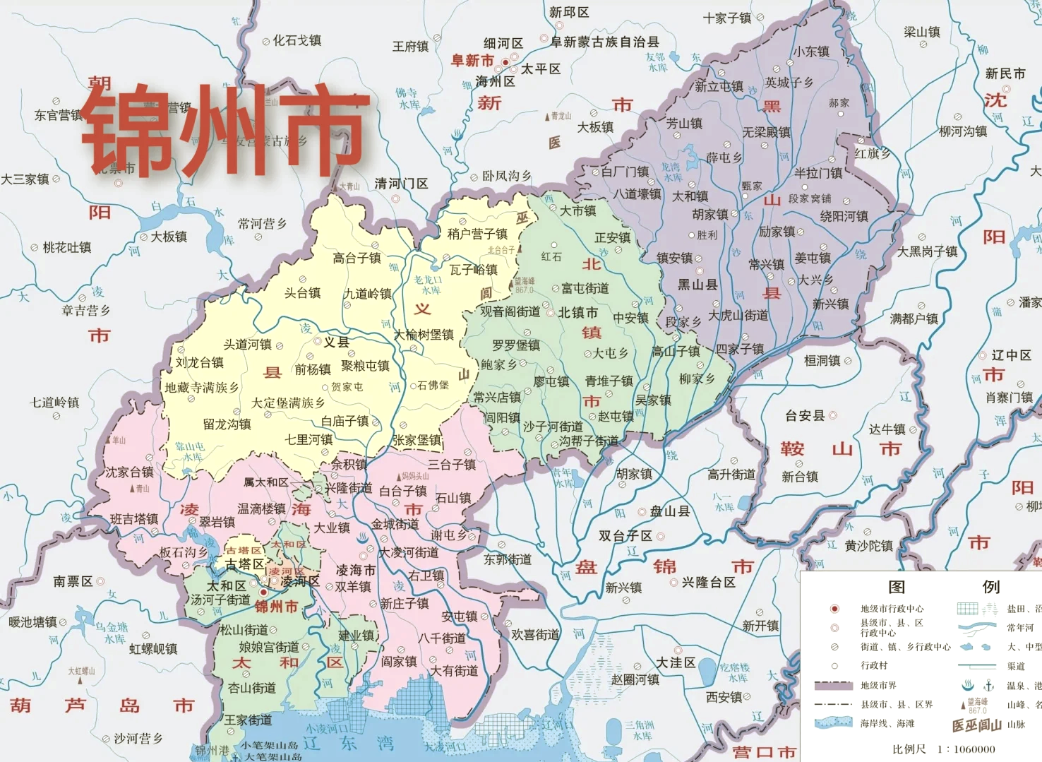 下辖区域:3个区(古塔区、凌河区、太和区)、2个县(黑山县、义县),代管2个县级市(北镇市、凌海市)。
