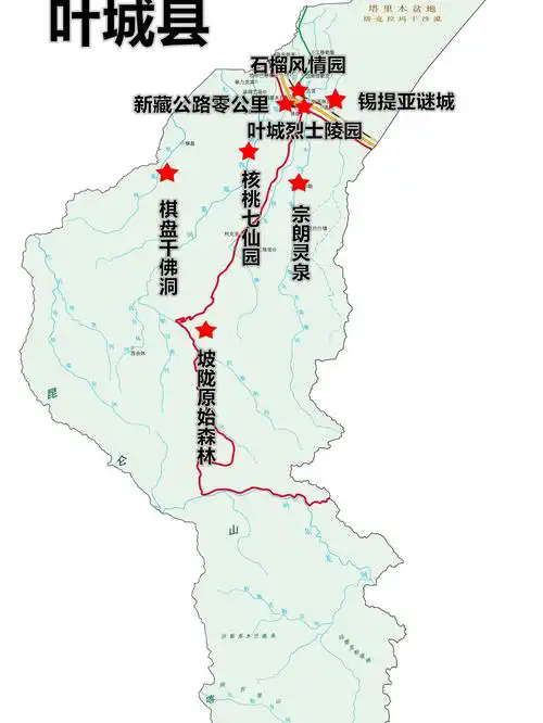 叶城县是古丝绸之路上的南道重镇,是“两区三地”交通集散地,新藏公路G219国道的西部起点,被誉为“天路零千米、昆仑第一城”之“探险宝地”。G315国道与G219国道在此交汇。 [19]享有“金果玉叶、铜铁之城”之称。当地旅游资源丰富,共有A级旅游景区10处。