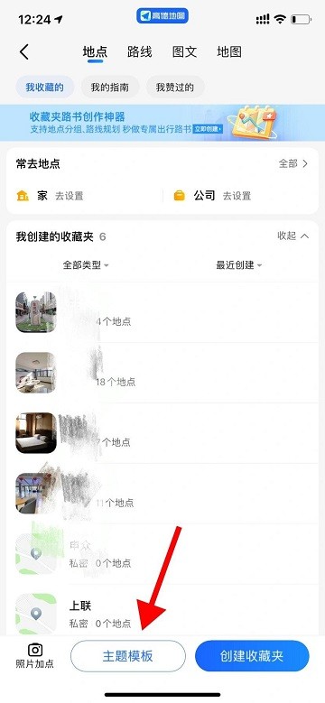 2.打开-我的-收藏夹-主题模板设置(可选择多种模版)我一般选择第二个-行程路线-模板,然后勾选你标记的地方,自动生成各个标记点之间的路线距离。