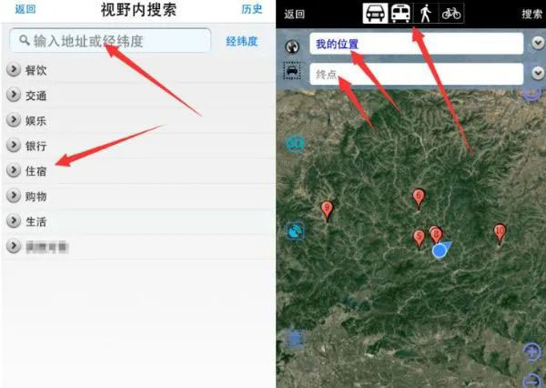 1、搜索功能可快速查找周边餐饮、公交站点、银行网点等生活设施,也支持手动输入地址进行精确定位;