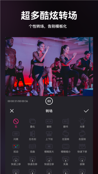 1、一键即可为视频添加转场,包括叠化、翻转、翻书、光晕、上下滑等形式;