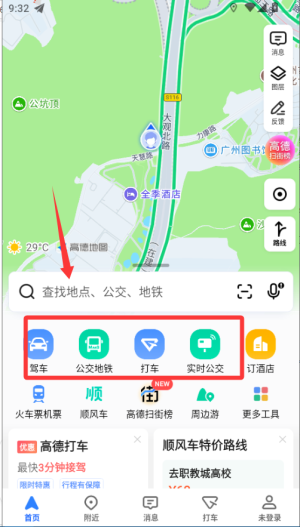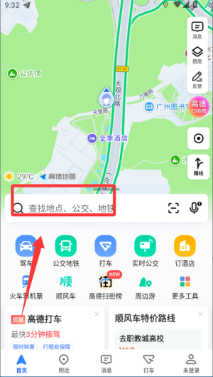 进入高德地图首页后,在底部搜索框中输入目标地点名称进行查找。