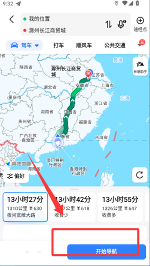 2、选择出行方式如驾车或公交,查看系统推荐的几条路线并选一条。