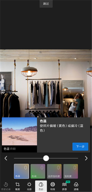 颜色调节:支持色温、色调、自然饱和度与整体饱和度独立调整