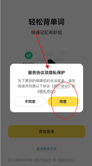 1、首次登录的用户会出现服务协议页面,点击下方的同意即可。