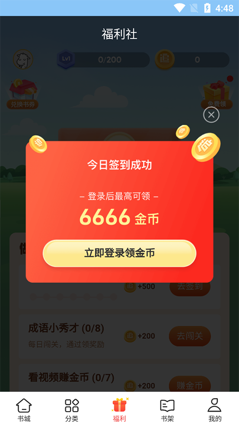 2、进入“福利社”页面后,参与每日签到即可领取金币奖励,连续登录还可获得额外加成,记得先完成账号登录哦。