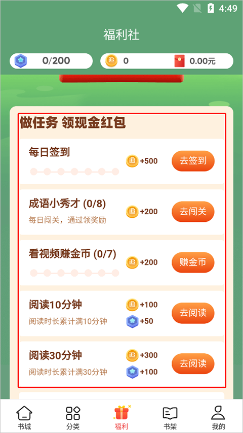 3、下方设有多种轻量任务,例如阅读时长达标、邀请好友、试用功能模块等,完成指定操作即可获得相应金币奖励。