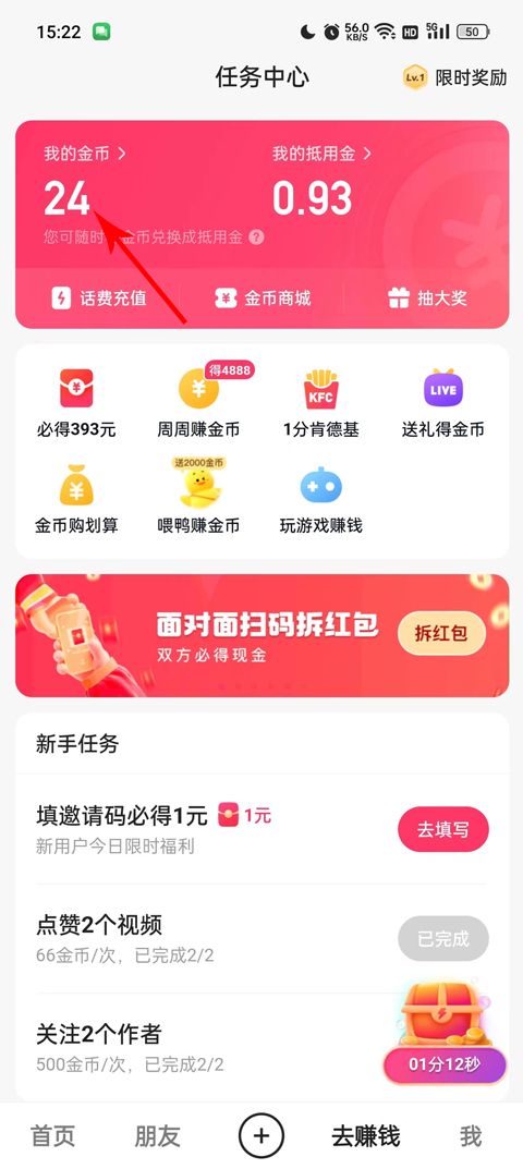 1、打开APP后点击首页“去赚钱”入口,进入任务中心页面;