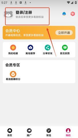 2.打开火星影视app,点击右下角“我的”,再点击上方登录/注册