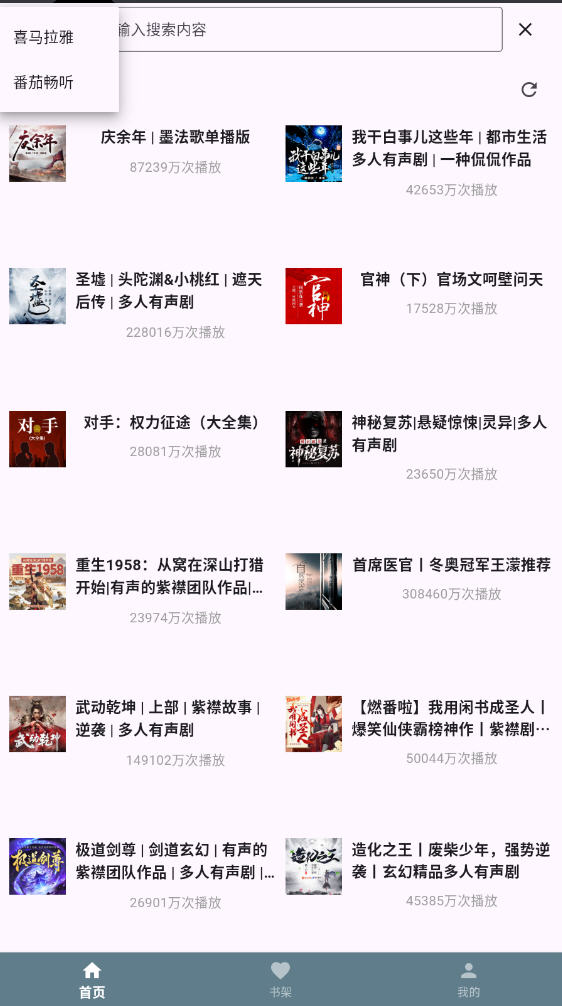 2、打开进入软件,可以切换书源,番茄畅听,喜马拉雅任意切换,解锁更多书源内容