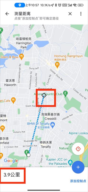 4、若测量路线较曲折,你可以点击右下角+号添加一个控制点,然后再继续进行测量