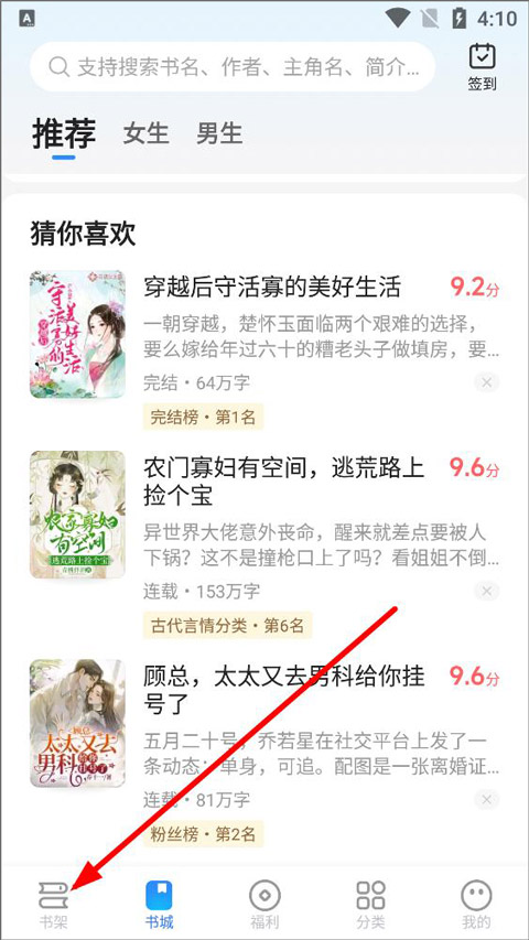 1、打开app,登录进入书城页面,用户可在书城查看推荐、男生、女生以及搜索想看的书籍,点击书架;