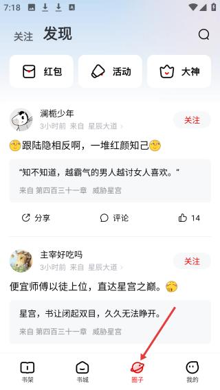 3、点击圈子页面,含关注和发现,能看到用户发布的小说相关讨论内容,可进行分享、评论。