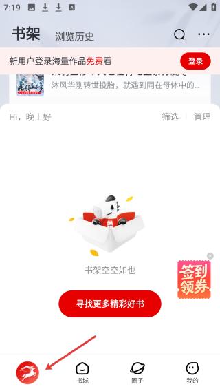 1、点击书架页面,提示新用户登录享免费作品,当前书架为空,可点击找好书,下方有功能栏。