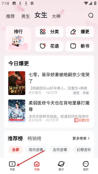 2、点击书城界面,分推荐等类别,有排行、分类等选项,展示今日爆更小说及推荐畅销榜单。