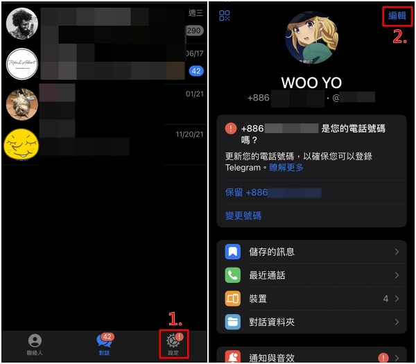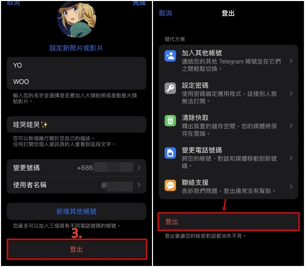 2、然后按下「编辑」按钮,点选底部的「登出」选项,这时系统会提醒你,一旦登出帐号,TG纸飞机app中的秘密对话就会被删除,了解后再点一次「登出」按钮即可。