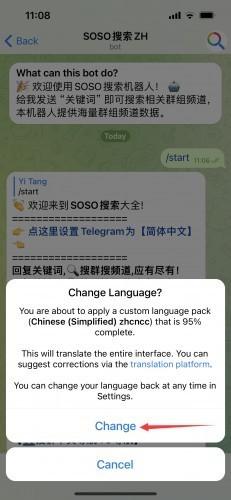 3、在聊天界面中,点击蓝色地址“点这里设置 Telegram为简体中文”。