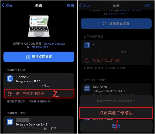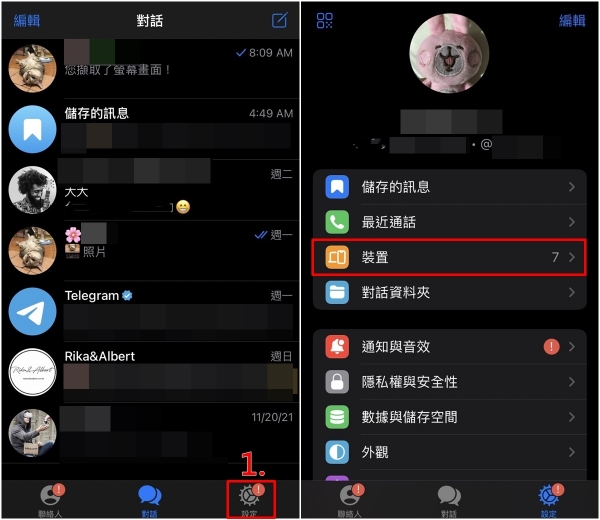 1、打开Telegram应用,点击右下角【设定】>进入【装置】页面,即可查看当前账号登录的所有设备列表。