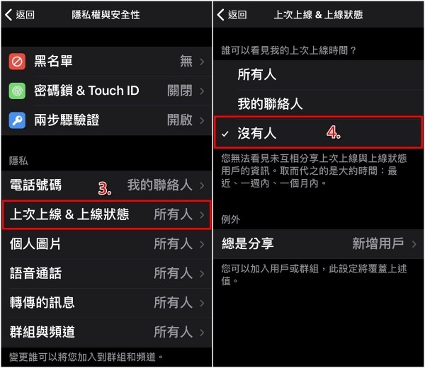 3、只要完成以上的设定后,以后其他用户就无法看到你详细的上线时间,而是会显示「最近上线」、「一周内」或「一个月内」等大范围的时间点;以后就甭怕被男/女朋友发现自己熬夜偷聊天、或是被老板同事抓包还在线上啦~