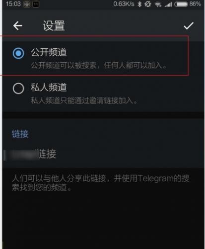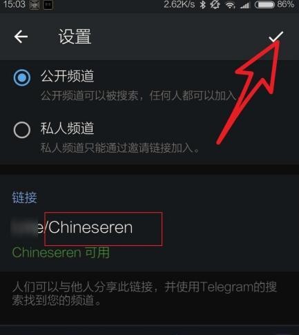 5、在“频道链接”栏输入自定义英文地址(如:@MyTechDaily),系统实时校验唯一性;确认无重复后点击右上角对勾,频道即正式启用。