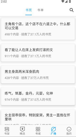 3、点击广场,提供书荒、书单服务,点击一个即可进入观看使用。