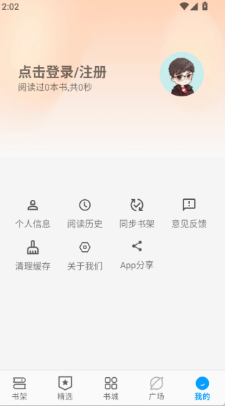 4、点击我的,点击登录或者注册即可,提供个人信息、阅读历史、同步书架、意见反馈等服务。