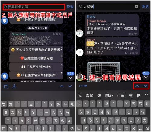 2、在顶端的搜索栏中,输入你要搜索的消息内容,左下角就会实时显示符合对应结果的消息内容,当让也可以点击右下角的箭头,查看上下文的消息内容。