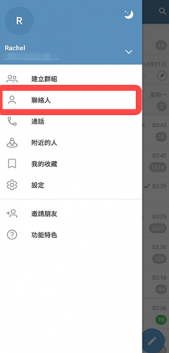 1、打开 telegreat 并进入联络人界面:在 Android 设备上打开 telegreat,点击左上角的 “菜单” 图标,然后点击 “联络人”。