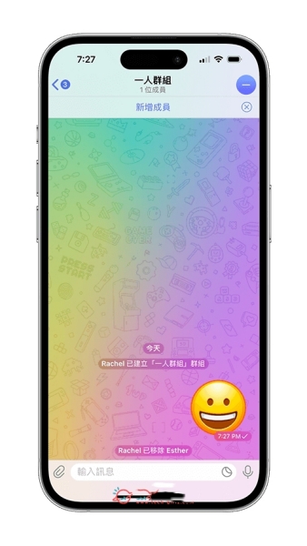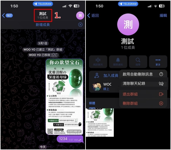 8、现在我们回到刚刚建立的Telegreat一人群组里,最上方会显示「1位成员」,代表这个Telegreat群组就只有你一个人,你所传送的照片、影片或档案等任何资料都只有你自己看得到,也只有你可以存取,接下来你就能自由运用。