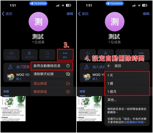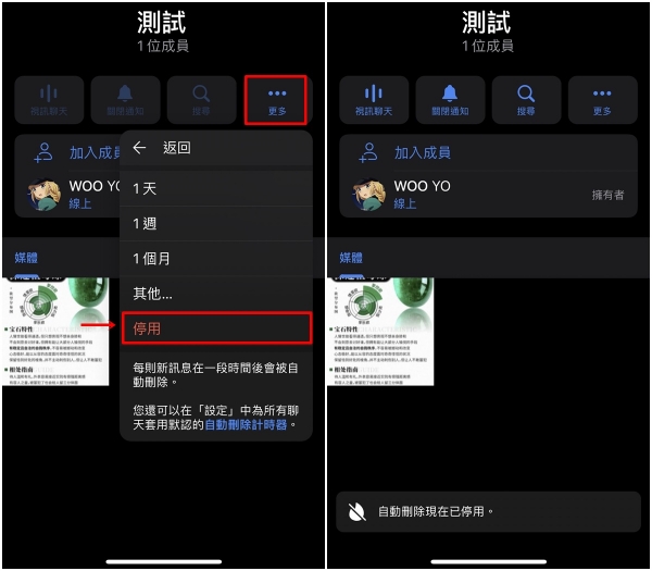 4、假如你设定好自动计时器却后悔了,可以点选聊天室顶端的「用户名称/群组名称」,按下「更多」>「自动删除消息」>「停用」即可取消。