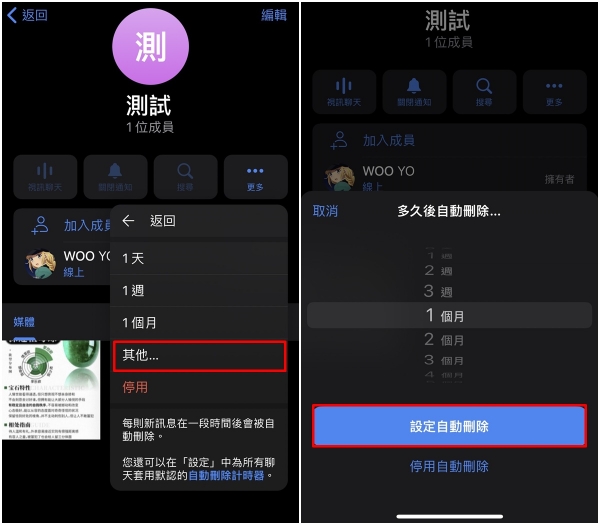 3、假如预设的时间选项没有符合你的需求,可以点选「自订」设定其他时间,再按下「设定自动删除」的按钮,这样日后只要指定间一到,纸飞机便会自动清除这个聊天室的讯息。