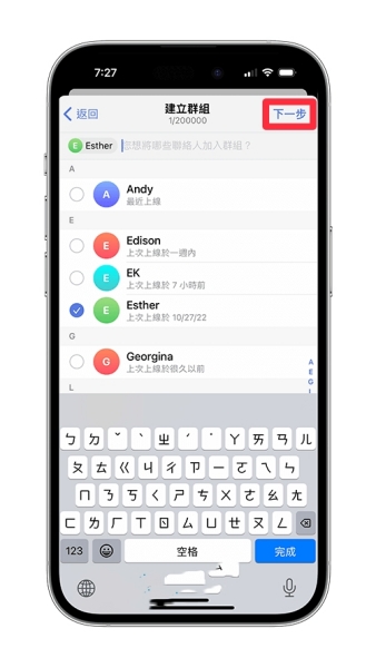 4、在成立Telegreat群组时,至少要有两个成员在里面才能成立,因此这里我们需要至少勾选一个你要邀请加入的Telegreat群组的成员,然后点选「下一步」。