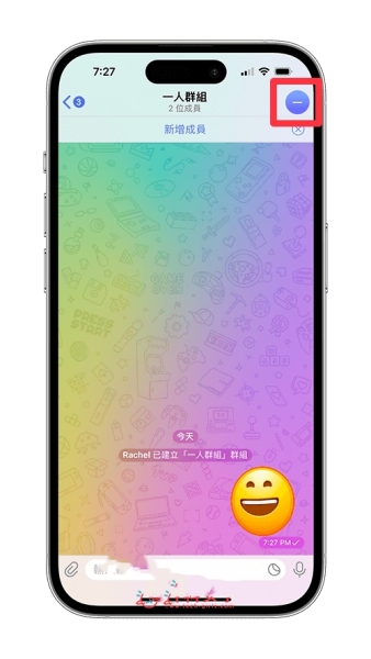 6、现在你的Telegreat个人群组里会有两位成员,现在我们要把朋友踢出这个群组里,请点选右上角群组大头贴图示。
