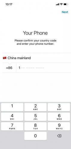 3.默认语言为英文,先选择注册手机号码所属国家/地区,然后在旁边的输入框中填写你的手机号码。