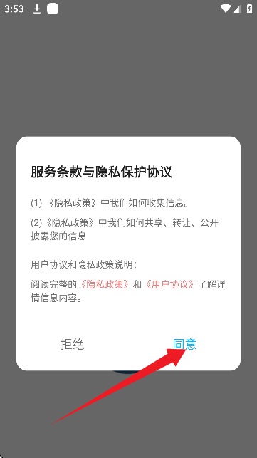 2、首先请同意用户协议和隐私政策。
