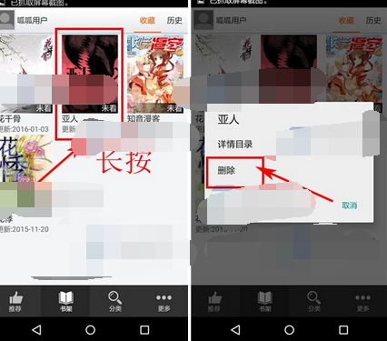 2)点击长按要删除的漫画,接着点击【删除】即可。(如下图)