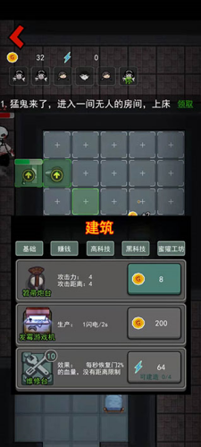 → 将床的收益升级到每跳+64 → 摆下4个维修台 → 升级游戏机到每跳+2 → 补出2个矿(一般铜矿)→ 考虑补炮塔 → 将门升级到钢门5