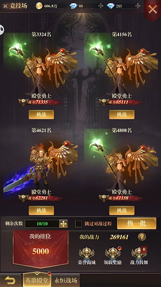 英雄殿堂是1对1的排名战玩法,玩家每天可挑战10次。玩家需要在系统匹配的4个对手中选择1人进行挑战。