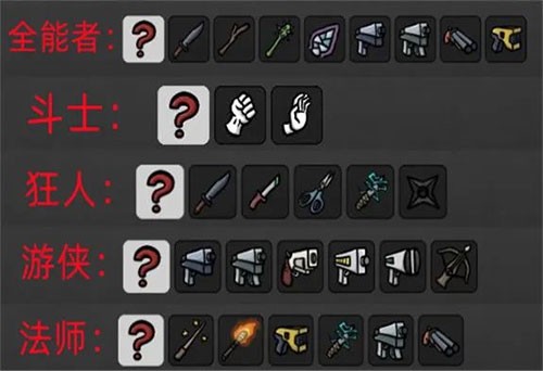 游戏开局提供五位基础角色:全能者、斗士、狂人、游侠与法师,每位角色拥有专属被动技能,并可在对应职业武器池中任选一把武器作为起始装备,奠定早期战斗风格。