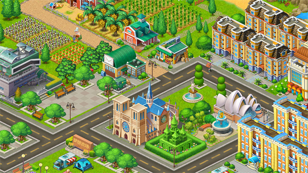 玩家将在游戏中体验从零开始建造农场和城镇。玩家会同时进行农场经营,包括养殖动物、收割农作物、完成NPC需求的无人机、飞艇、火车等多种订单,并获得物品奖励,再进行建造超市、商铺、住宅等,提升农场的人口和装饰农场,最终建造成一个玩家梦想中的小镇!
