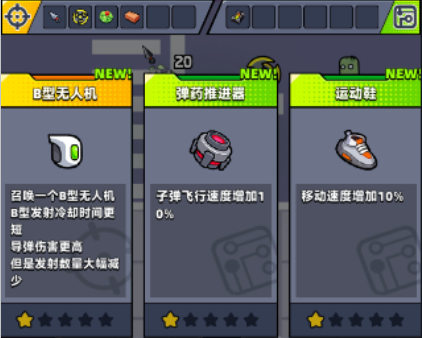 灵活跑位很重要。具体说一下,小编个人用的是紫色的苦无 (超武,补给是加经验),开局2级,遇到一定拿的是砖头(超武)+雷电(超武,补给效果是缩短冷却。非常好用)十钻头(超武,补给效果是飞行速度)+磁场/燃烧瓶,/挡子弹那个/回旋镖/机器人(五选二),如果是拿了回旋镖可以升超武。因为五选二的里边几个是可以不用升的,所以节约了2个补给格子,拿攻击加成和磁铁。这样的组合基本上能通大部分图,升级武器的优先度,是钻头优先,如果拿到了经验加成,才考虑升苦无。苦无有没有升超武的区别非常大。急用走位,让钻头集中在怪群里面飞,达到群攻的效果,前期非常好用。