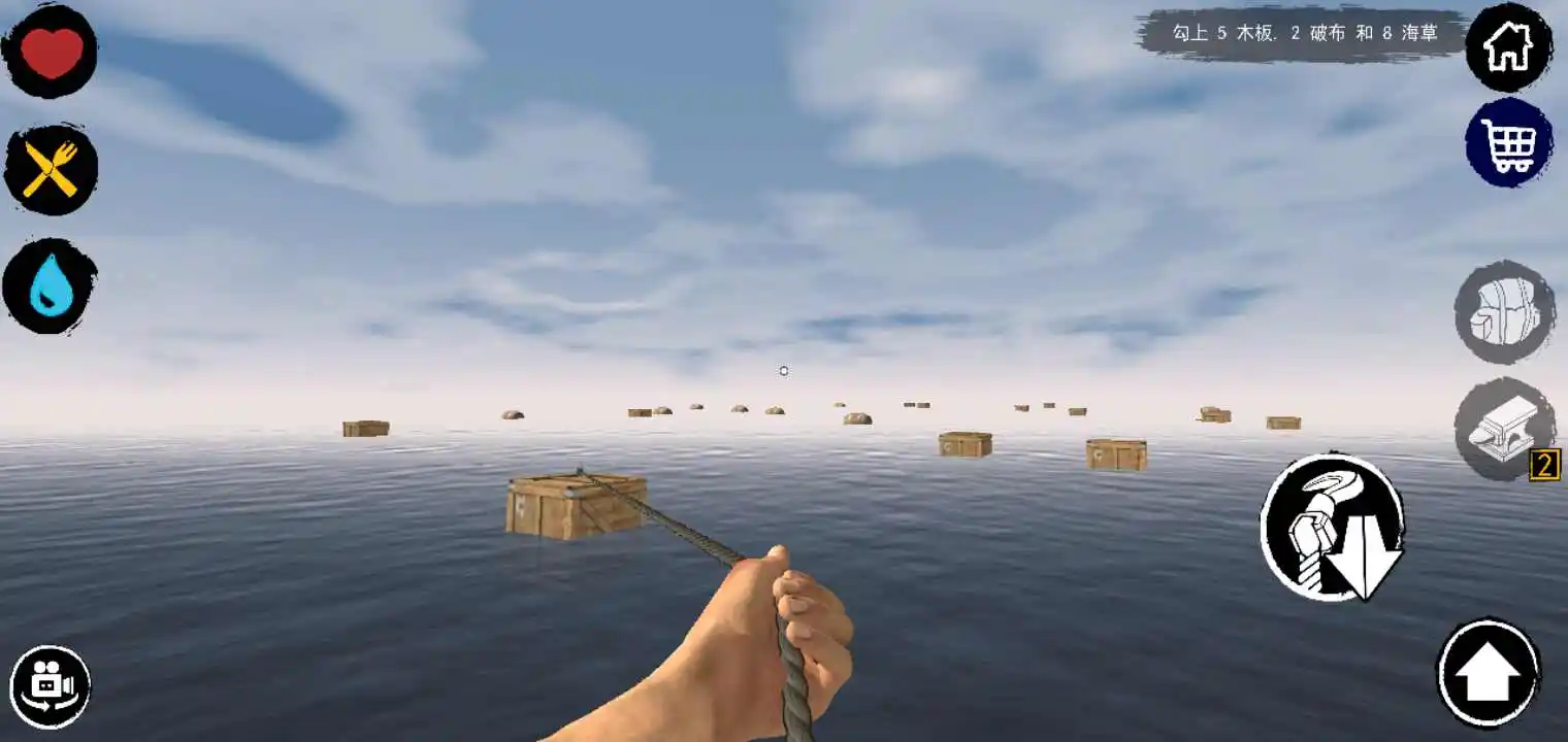 木板:漂流在海面上的木板是建造和制作工具的基本材料。用钩子拖拽这些木板到你的木筏上。