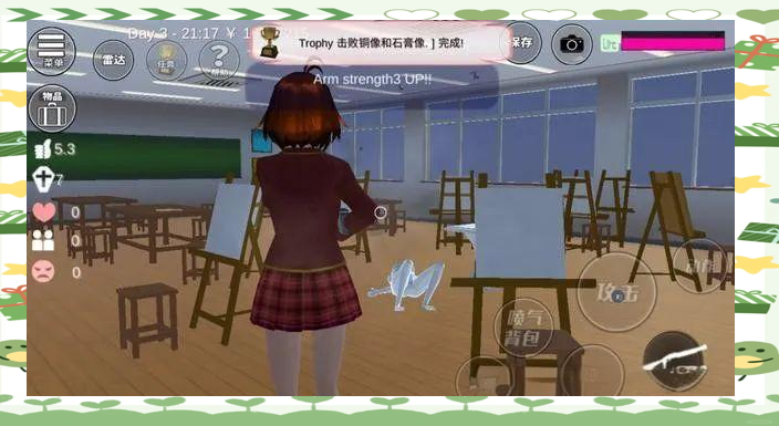 5、夜幕降临,当钟声敲响19:00的那一刻,你迅速前往学校三楼的书道室。在那里,你会看到一个铜像静静地伫立着。然而,当你靠近它时,它会瞬间发动攻击。你必须毫不畏惧,果断应对,才能成功将它解决。