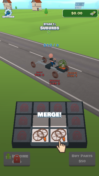 合成竞速之王免广告,这款游戏采用简单的3D卡通画面制作,在这里玩家只需要将车辆放置在赛道上就能获得奖励,还能购买各种各样的零件,通过合成就能进行升级,从而提升赛车的性能。